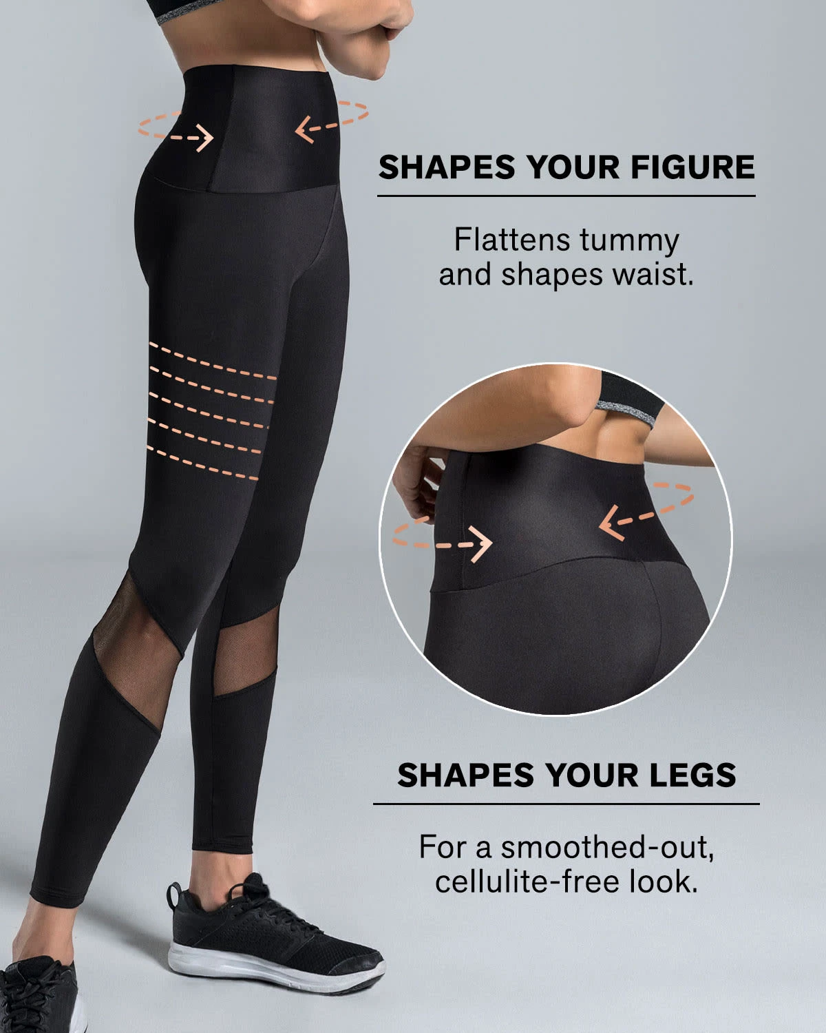 • Moderate compression in the thighs for shaping and to prevent chafing.